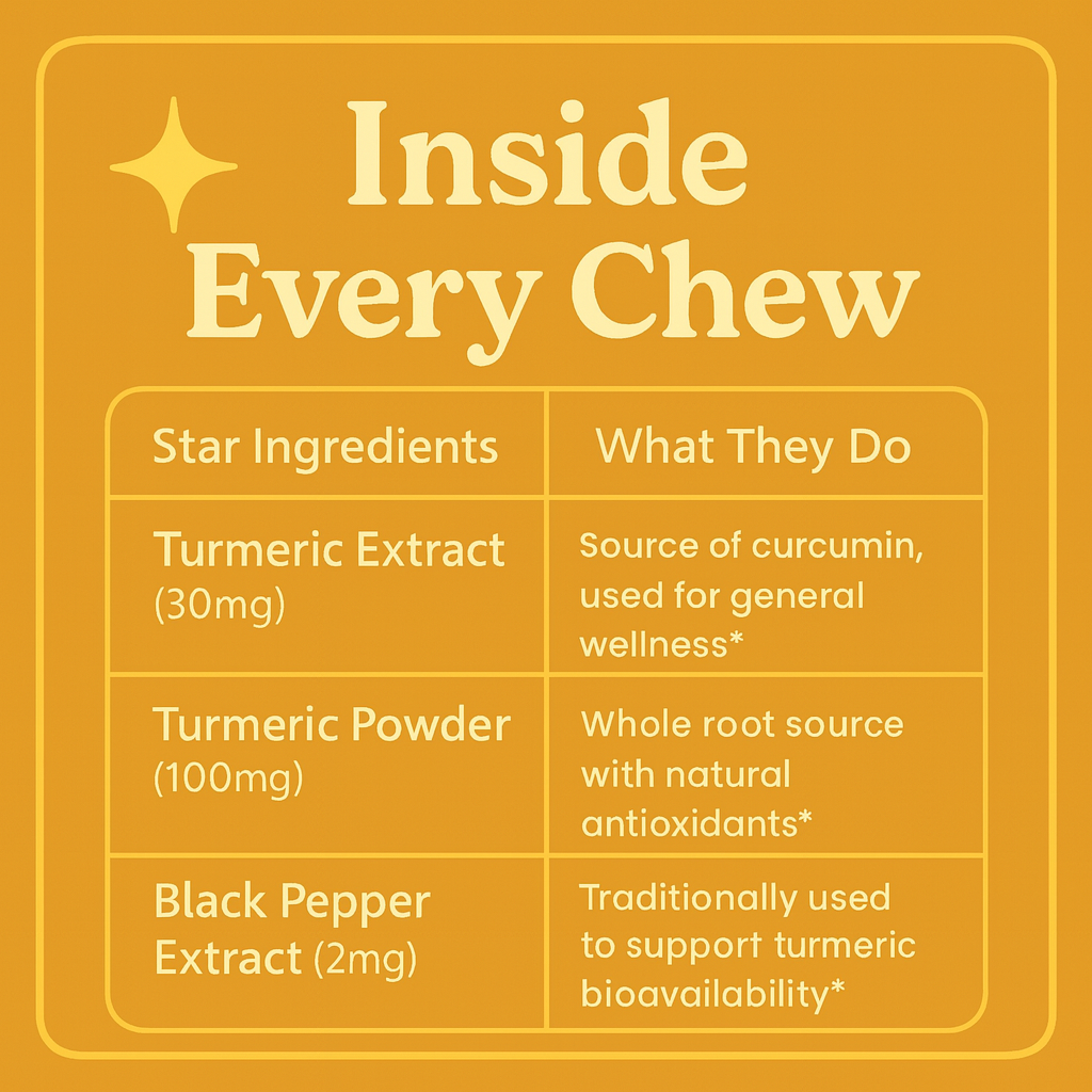 Sodium (as Sodium Citrate), Turmeric Extract (Curcuma longa L.)(root), Black Pepper Extract (Piper nigrum)(fruit), Turmeric Powder (Curcuma longa L.)(root), Glucose Syrup, Sugar, Glucose, Pectin, Citric Acid, Sodium citrate, Vegetable Oil, (contains Carnauba Wax), Ginger Flavor.